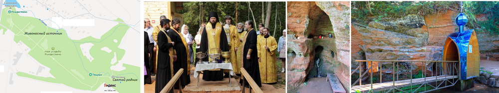 Святой родник и Животворящий источник находится в усадьбе Рождествено (Ленинградская область), расположенной у федеральной автомобильной дороги Р-23 «Псков». Объекты показа – потоки, вытекающие из карстово-суффозионных пещер, образовавшихся в красноцветных песчаниках среднего девона.