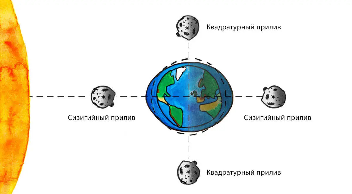 Квадратурный прилив (квадратура – от лат. quadratura – ‘придание квадратной формы’) приходится на время первой и последней четвертей (квадратур) Луны, когда направления на Луну и Солнце образуют прямой угол и влияние Солнца ослабляет влияние Луны. В результате высота сизигийного прилива примерно втрое больше высоты квадратурного. Самые высокие сизигийные приливы наблюдаются, когда Луна проходит точку полнолуния и точку перигея (от греч. Περίγειος – ‘земной’ - ближайшая к Земле точку орбиты) примерно в одно и то же время. Величина приливообразующей силы Луны в перигее примерно на 40% больше, чем в апогее [БРЭ].