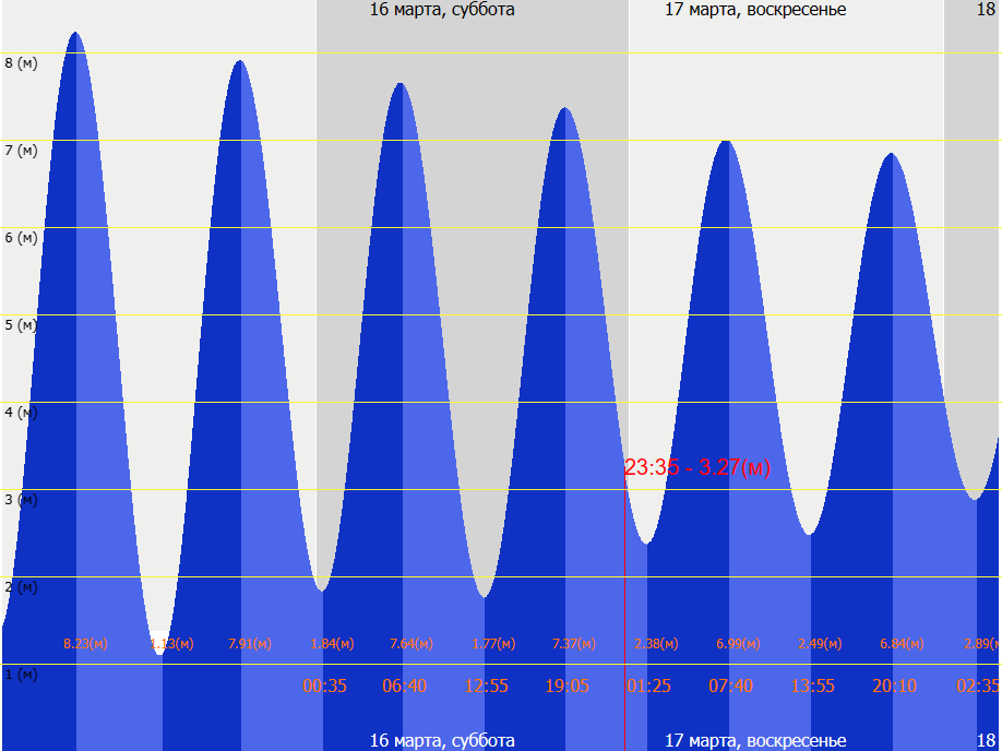 - График приливов и отливов в Архангельске. Февраль-март 2024 г.