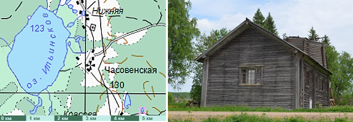 Часо́вня – ‘небольшое церковное строение с иконами, но в отличие от церкви без алтаря’: «Была́ ма́ленькая часо́вня, мы там, нас крести́ли» (Кочкомозеро) [Мызников, 2021, с. 540]; «Излажуся да схожу в часовню, надо богу помолиться» (Ник. Юшк.) [СВГ, 3, 12].