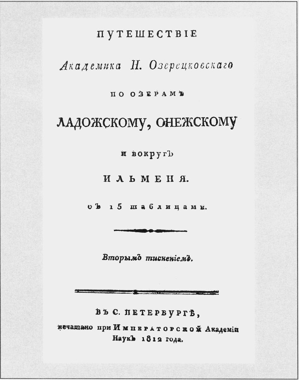 - Озерецковский Н.Я. Путешествие академика Н. Озерковского по озёрам Ладожскому, Онежскому и вокруг Ильменя