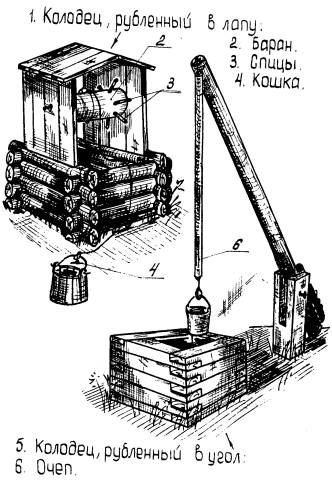 Из мелких колодцев воду черпали ведром, привязанным к веревке или прикрепленным через дужку к деревянному шесту. Самыми распространенными водоподъемными сооружениями были «журавль» (коромысло, оцеп, очеп) и «баран». Первый использовали для подъема воды из колодца глубиной не более 8 м. Он состоял из высокого столба с развилиной наверху, в которую вставлялась длинная жердь-очеп, коромысло. На тонком и длинном ее конце укрепляли намертво на веревке или цепи бадью, на толстом коротком конце закрепляли груз: камень, обрубок дерева. Точка опоры располагалась таким образом, что человек легко опускал пустую бадью. Легкость подъема обеспечивал противовес на толстом конце жерди. Высота столба и длина очепа зависели от глубины колодца. «Баран» представлял собой деревянный, горизонтально положенный вал, заведенный концами в два столба, врытых в землю по сторонам колодца. На вал наматывалась цепь или веревка с бадьей на конце. Вал можно было вращать за четыре ручки, вбитые в него по радиусу, за железную изогнутую рукоятку в торце вала или за маховое колесо диаметром до 2,5 м, насаженное на конец вала.