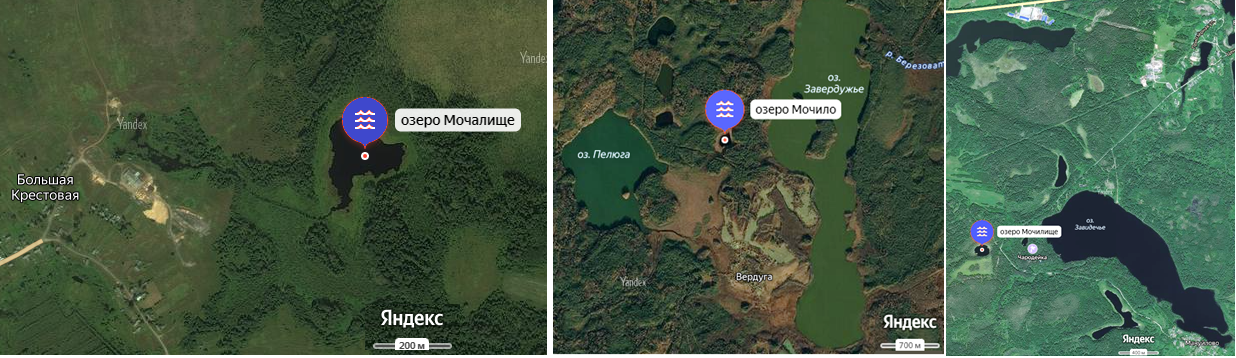 - Локализация мочильных озер: озера Мочалище и Мочалище, Окуловский район, Новгородская область; озеро Мочило, Лужский район, Ленинградская область.