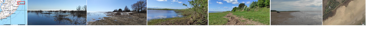 Побережье озера Ильмень во время весеннего половодья и летне-осенней межени: Южный глинт – уступ в породах верхнего девона на южном берегу озера у деревень Устрека, Пустошь, Ретлё, Коростынь; западный аккумулятивный берег у деревень Курицко, Еруново и др.