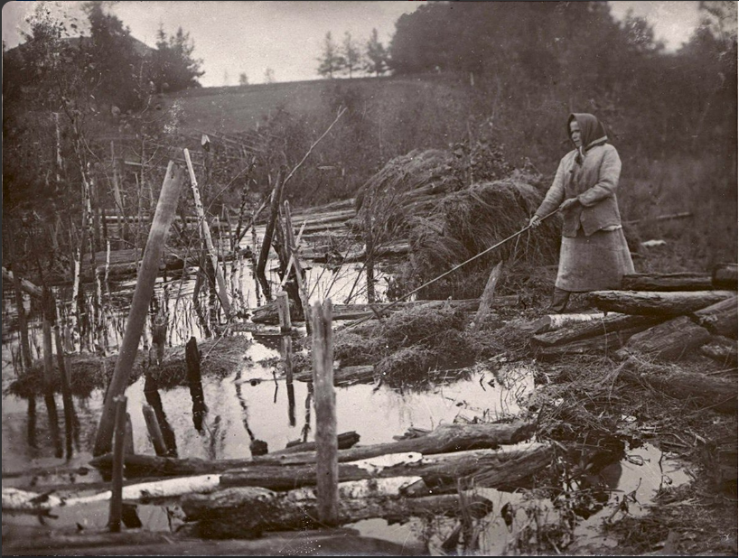 - Вымачивание льна в огороженном кольями мочиле (мочевиле, мочилище). Фото из альбома Присвирье прошлого века