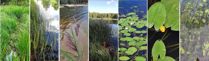 - Растения – индикаторы зон зарастания: 1 – осока – Carex sp.; 2- хвощ речной – Equisetum fluviatile ; 3 – тростник обыкновенный - Phragmites australis (Cav.) Trin. ex Steud.; 4 – камыш озерный – Schoenoplectus lacustris (L.) Palla; 5 – кувшинка белая – Nymphaea alba L.; 6 – кубышка желтая – Nuphar lutea (L.) Sm.; 7 – рдест – Potamogeton sp.